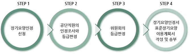 - 장기요양인정절차는 먼저 공단에 장기요양인정신청으로부터 출발하여 공단직원의 방문에 의한 인정조사와 등급판정위원회의 등급판정 그리고 장기요양인정서와 표준장기요양이용계획서의 작성 및 송부로 이루어집니다.